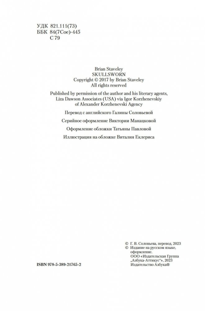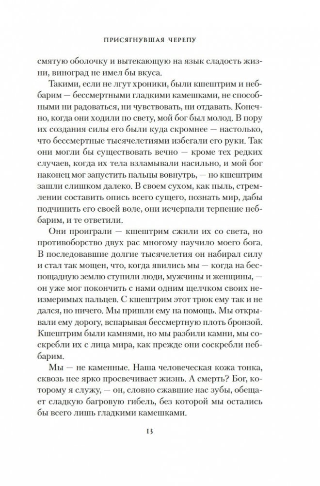 Ей не нравится, когда ее называют Присягнувшая Черепу. Это не передает и доли ее преданности Ананшаэлю, богу смерти. Она мечтает стать его жрицей, и теперь ей осталось пройти последнее испытание. У нее будет четырнадцать дней на то, чтобы убить семерых, описанных в древней ритуальной песне, включая того, кто заставит ее душу и тело петь от любви. Пирр — воплощенная смертоносная сила и с легкостью принесет в жертву божеству человеческую жизнь, а если придется, отдаст и собственную. Она никогда ни с кем себя не связывала. Лишь однажды ей довелось встретить человека, которого она... запомнила. Он подавил мятеж в Домбанге — тысячелетнем городе, что стоит над болотом, кишащим злобными тварями. Пирр вместе с двумя свидетелями отправляется туда, чтобы среди темных извилистых каналов найти этого человека и покончить с ним... Роман из вселенной «Хроник Нетесаного трона». Впервые на русском!