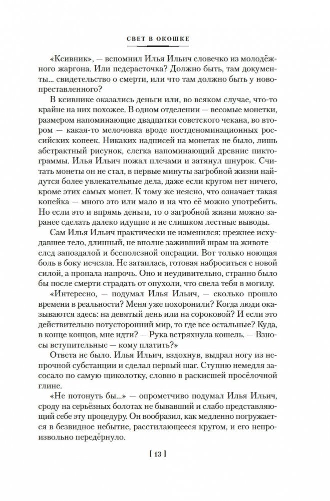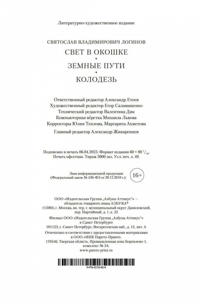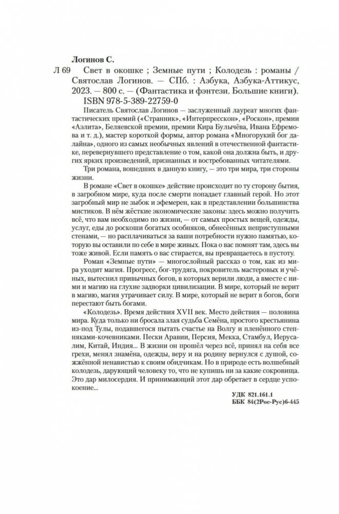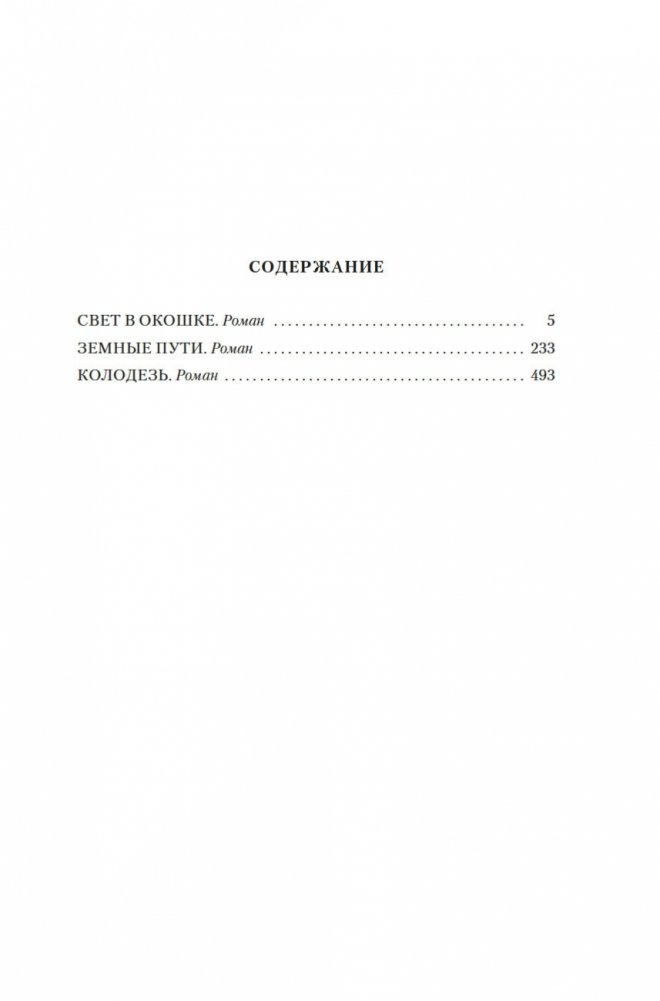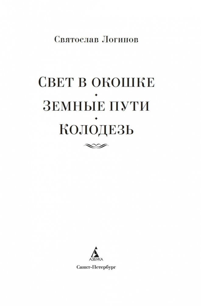 Писатель Святослав Логинов — заслуженный лауреат многих фантастических премий («Странник», «Интерпресскон», «Роскон», премии «Аэлита», Беляевской премии, премии Кира Булычёва, Ивана Ефремова и т. д.), мастер короткой формы, автор романа «Многорукий бог далайна», одного из самых необычных явлений в отечественной фантастике, перевернувшего представление о том, какой она должна быть, и других ярких произведений, признанных и востребованных читателями. Три романа, вошедших в данную книгу, — это три мира, три стороны жизни. В романе «Свет в окошке» действие происходит по ту сторону бытия, в загробном мире, куда после смерти попадает главный герой. Но этот загробный мир не зыбок и эфемерен, как в представлении большинства мистиков. В нём жёсткие экономические законы: здесь можно получить всё, что вам необходимо по жизни, — от самых простых вещей, одежды, услуг, еды до роскоши богатых особняков, обнесённых неприступными стенами, — но расплачиваться за ваши потребности нужно памятью, которую вы оставили по себе в мире живых. Пока о вас помнят там, здесь вы тоже живой. Если память о вас стирается, вы превращаетесь в пустоту. Роман «Земные пути» — многослойный рассказ о том, как из мира уходит магия. Прогресс, бог-трудяга, покровитель мастеровых и учёных, вытеснил привычных богов, в которых верили люди, а вместе с ними и магию на глухие задворки цивилизации. В мире, который не верит в магию, магия утрачивает силу. В мире, который не верит в богов, боги перестают быть богами. «Колодезь». Время действия XVII век. Место действия — половина мира. Куда только ни бросала злая судьба Семёна, простого крестьянина из-под Тулы, подавшегося пытать счастье на Волгу и пленённого степняками-кочевниками. Пески Аравии, Персия, Мекка, Стамбул, Иерусалим, Китай, Индия… В жизни он прошёл через всё, принял на себя все грехи, менял знамёна, одежды, веру и на родину вернулся с душой, сожжённой ненавистью к своим обидчикам. Но в природе есть волшебный колодезь, дарующий человеку то, что не купишь ни за какие сокровища. Это дар милосердия. И принимающий этот дар обретает в сердце успокоение...