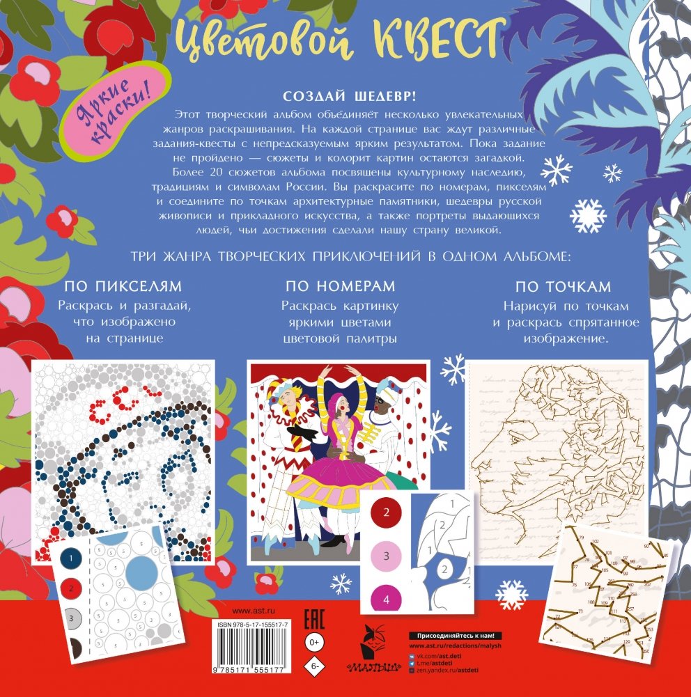 Этот творческий альбом объединяет несколько увлекательных жанров раскрашивания. На каждой странице вас ждут различные задания-квесты с непредсказуемым ярким результатом. Пока задание не пройдено — сюжеты и колорит картин остаются загадкой. Более 20 сюжетов альбома посвящены культурному наследию, традициям и символам России. Вы раскрасите по номерам, пикселям и соедините по точкам архитектурные памятники, шедевры русской живописи и прикладного искусства, а также портреты выдающихся людей, чьи достижения сделали нашу страну великой.