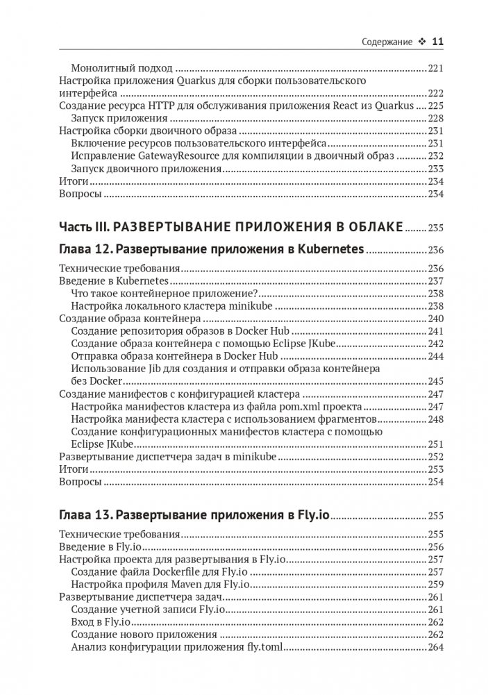 В этой книге описывается создание и развертывание комплексного веб-приложения с использованием Quarkus и React. В первой части представлено базовое введение в Quarkus, рассказывается о его возможностях. Вы узнаете, как запустить проект Quarkus и как создать надежный HTTP-сервер для вашего приложения. Во второй части показано, как создать пользовательский интерфейс с поддержкой React и как интегрировать его с серверной частью Quarkus. Прочитав последнюю часть, вы научитесь создавать манифесты конфигурации кластера и развертывать их в Kubernetes и других альтернативах, таких как Fly.io.