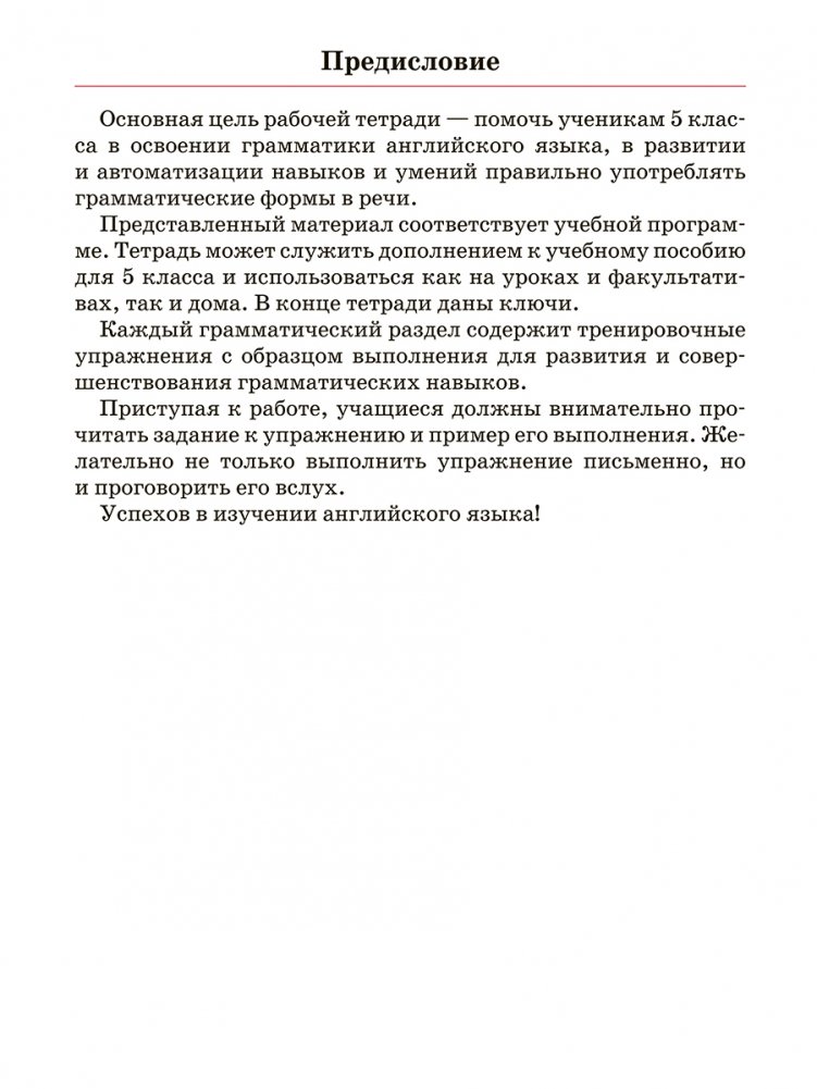 Эта тетрадь поможет ученикам 5 класса в освоении грамматики английского языка, в развитии и автоматизации языковых навыков и умения правильно употреблять грамматические формы в устной речи. В пособии представлен материал, соответствующий школьной программе. Оно может служить дополнением к учебнику и использоваться как на уроках и факультативах, так и для самостоятельной работы дома.