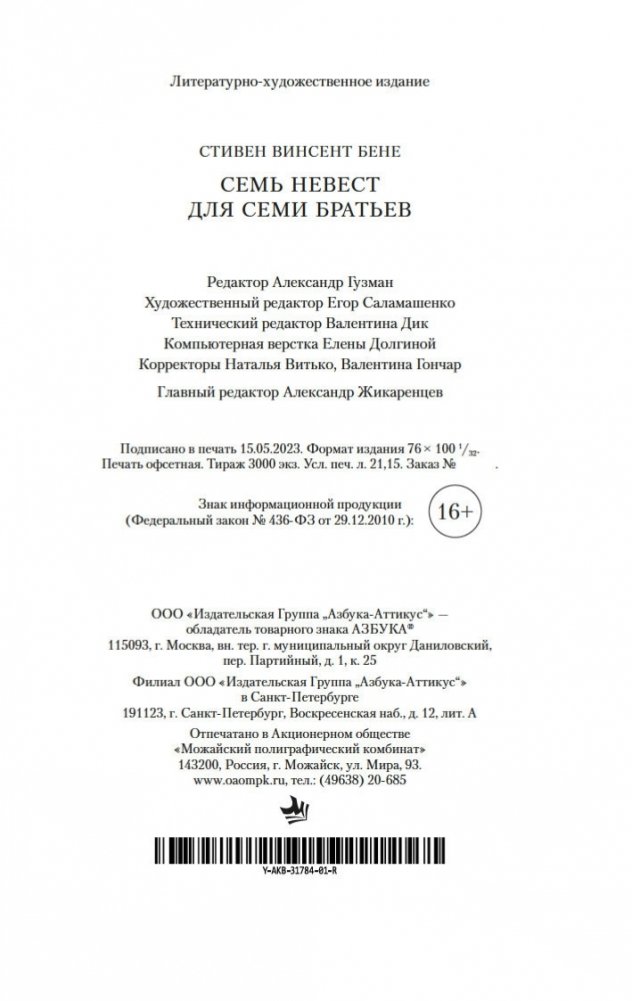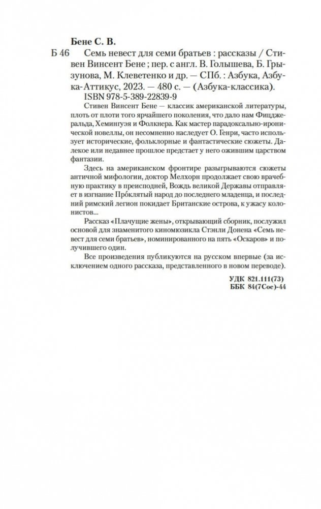 Стивен Винсент Бене — классик американской литературы, плоть от плоти того ярчайшего поколения, что дало нам Фицджеральда, Хемингуэя и Фолкнера. Как мастер парадоксально-иронической новеллы, он несомненно наследует О. Генри, часто использует исторические, фольклорные и фантастические сюжеты. Далекое или недавнее прошлое предстает у него ожившим царством фантазии. Здесь на американском фронтире разыгрываются сюжеты античной мифологии, доктор Мелхорн продолжает свою врачебную практику в преисподней, Вождь великой Державы отправляет в изгнание Про`клятый народ до последнего младенца, и последний римский легион покидает Британские острова, к ужасу колонистов... Рассказ «Плачущие жены», открывающий сборник, послужил основой для знаменитого киномюзикла Стэнли Донена «Семь невест для семи братьев», номинированного на пять «Оскаров» и получившего один. Все произведения публикуются на русском впервые (за исключением одного рассказа, представленного в новом переводе).