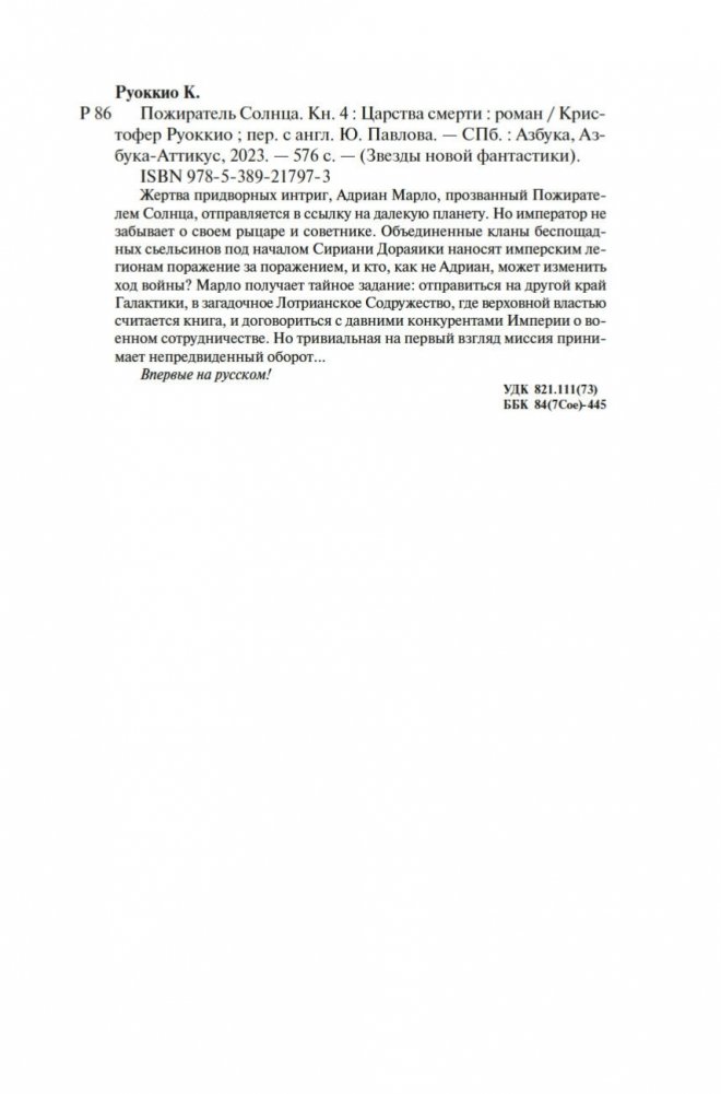 Жертва придворных интриг, Адриан Марло, прозванный Пожирателем Солнца, отправляется в ссылку на далекую планету. Но император не забывает о своем рыцаре и советнике. Объединенные кланы беспощадных сьельсинов под началом Сириани Дораяики наносят имперским легионам поражение за поражением, и кто, как не Адриан, может изменить ход войны? Марло получает тайное задание: отправиться на другой край Галактики, в загадочное Лотрианское Содружество, где верховной властью считается книга, и договориться с давними конкурентами Империи о военном сотрудничестве. Но тривиальная на первый взгляд миссия принимает непредвиденный оборот... Впервые на русском!