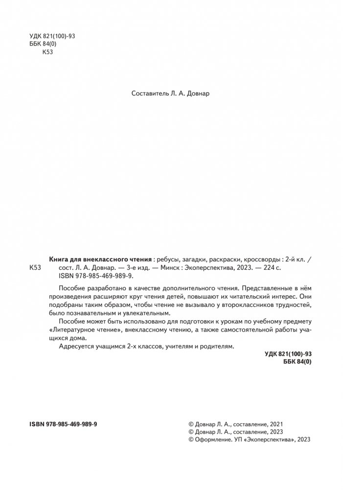 Пособие разработано в качестве дополнительного чтения. Представленные в нем произведения расширяют круг чтения детей, повышают их читательский интерес. Они подобраны таким образом, что чтение не вызывало у второклассников трудностей, было познавательным и увлекательным.