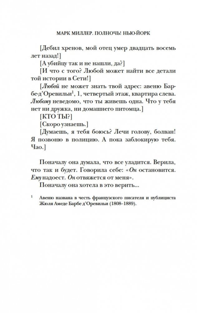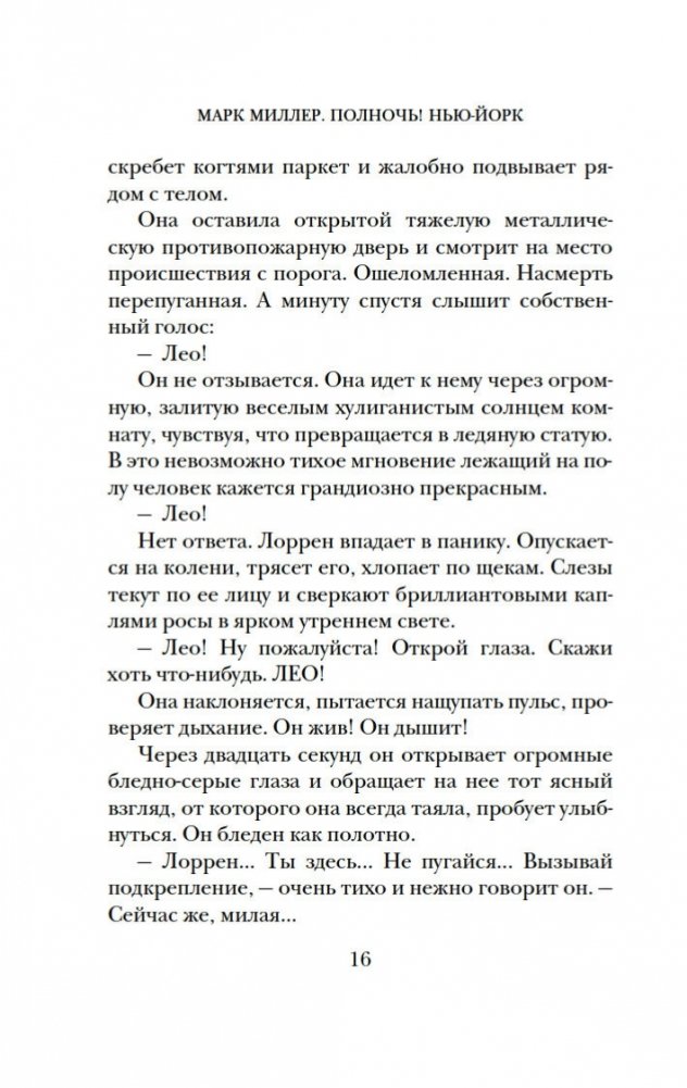 Однажды издателю Бернару Фиксо позвонил незнакомец, француз из Нью-Йорка, — пообещал прислать любопытный роман и бросил трубку. Вскоре под дверью у Фиксо возник пакет с рукописью. Подобные фокусы редко производят впечатление на опытных издателей, но из любопытства Фиксо эту рукопись прочел — и восхитился, и тотчас ее напечатал. Так состоялся громкий дебют Марка Миллера, самого таинственного французского автора, написавшего эту захватывающую историю. Париж. Лоррен, сотрудница пиар-агентства, тонкая ценительница искусства, едет в Нью-Йорк, где ей предстоит повышение. Неизвестный человек, якобы много лет назад убивший ее отца, шлет ей письма с угрозами, ее жизнь в опасности, но это обстоятельство Лоррен от всех скрывает. Нью-Йорк. Лео, талантливый художник, выходит из тюрьмы, где просидел три года за подделку картин великих мастеров. Покупатели подделок недовольны, и на свободе Лео предстоят крупные неприятности. Конечно, эти двое встретятся. Конечно, им предстоят великие испытания и великая любовь. И конечно, их общая история превратится в головокружительное приключение, потому что их жизни переплелись много лет назад, хотя оба они об этом не подозревают, а угрозы преследователя отнюдь не пусты. Марк Миллер написал романтичную и напряженную историю, в которой смешались любовь, искусство, алчность, тайны происхождения и непредсказуемость судеб. Что еще нужно для увлекательного романа? Знать, кто его написал, — но имя автора окутано тайной. Марк Миллер тщательно оберегает свое инкогнито, и критики, превознося его дебют «Полночь! Нью-Йорк», относительно личности автора теряются в догадках вместе с читателями. Перед вами, таким образом, двойная интрига: история Лео и Лоррен и история автора — и одну из этих историй вы дочитаете до финала на одном дыхании.