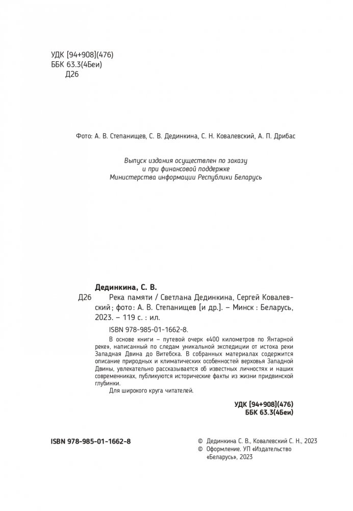 В основе книги — путевой очерк «400 километров по Янтарной реке», написанный по следам уникальной экспедиции от истока реки Западная Двина до Витебска. В собранных материалах содержится описание природных и климатических особенностей верховья Западной Двины, увлекательно рассказывается об известных личностях и наших современниках, публикуются исторические факты из жизни придвинской глубинки.