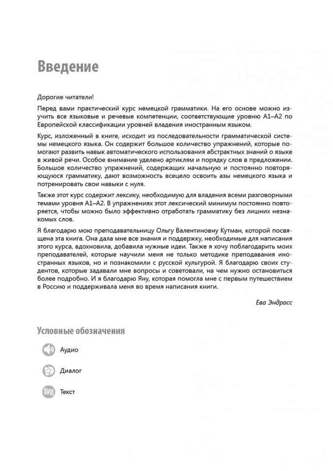 Учебник удобен в использовании: выполнять упражнения можно прямо в книге, в конце пособия даны ключи для самопроверки. К разделу фонетики добавлена аудиозапись, которая поможет привыкнуть к правильному звучанию немецкой речи и поработать над произношением. Текст читает автор учебника, преподаватель с большим стажем и носительница немецкого языка Ева Эндрасс.