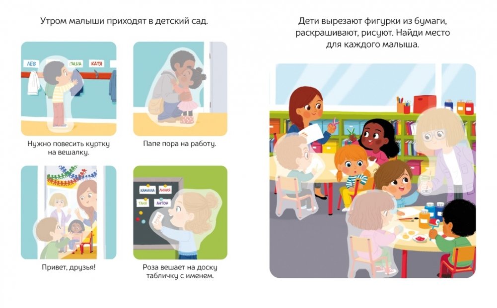 Подбери подходящие наклейки и узнай, чем ещё занимаются малыши в детском саду.