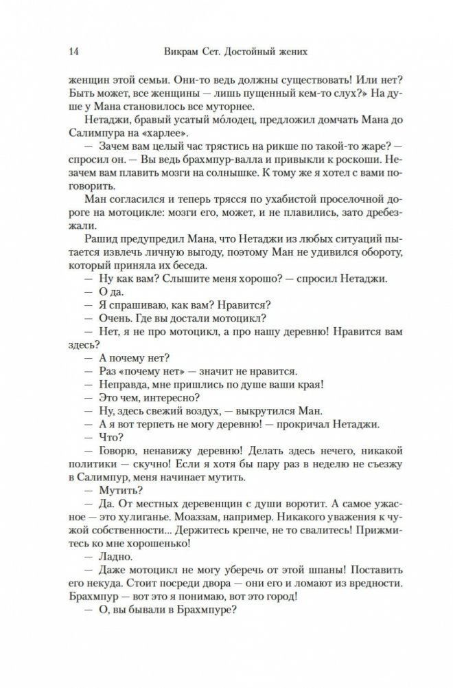 Современный классик Викрам Сет — настоящий гражданин мира. Родился в Индии, учился в Оксфорде, а также в Стэнфордском университете в Калифорнии, где вместо диссертации по экономике написал свой первый роман «Золотые Ворота» об американских яппи — и это был роман в стихах; более того, от начала до конца написанный онегинской строфой. А через много лет работы вышел и «Достойный жених» — «эпопея, многофигурная, как романы Диккенса или Троллопа, и необъятная, как сама Индия» (San Francisco Chronicle), рекордная по многим показателям: самый длинный в истории английской литературы роман, какой удавалось опубликовать одним томом; переводы на три десятка языков и всемирный тираж, достигший 26 миллионов экземпляров. Действие происходит в вымышленном городе Брахмпур на берегу Ганга вскоре после обретения Индией независимости; госпожа Рупа Мера, выдав замуж старшую дочь Савиту, пытается найти достойного жениха для младшей дочери, студентки Латы, — а та, как девушка современная, имеет свое мнение на этот счет и склонна слушать не старших, а свое сердце. Теперь ей предстоит выбрать из трех ухажеров — сверстника-студента Кабира, знаменитого поэта Амита и Хареша, восходящей звезды обувного бизнеса... В 2020 году первый канал Би-би-си выпустил по роману мини-сериал, известный по-русски как «Подходящий жених»; постановщиком выступила Мира Наир («Ярмарка тщеславия», «Нью-Йорк, я люблю тебя»), а сценарий написал прославленный Эндрю Дэвис («Отверженные», «Война и мир», «Возвращение в Брайдсхед», «Нортэнгерское аббатство», «Разум и чувства»).
