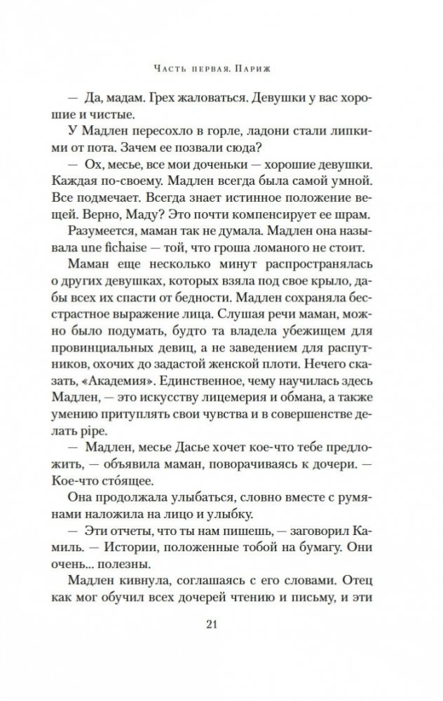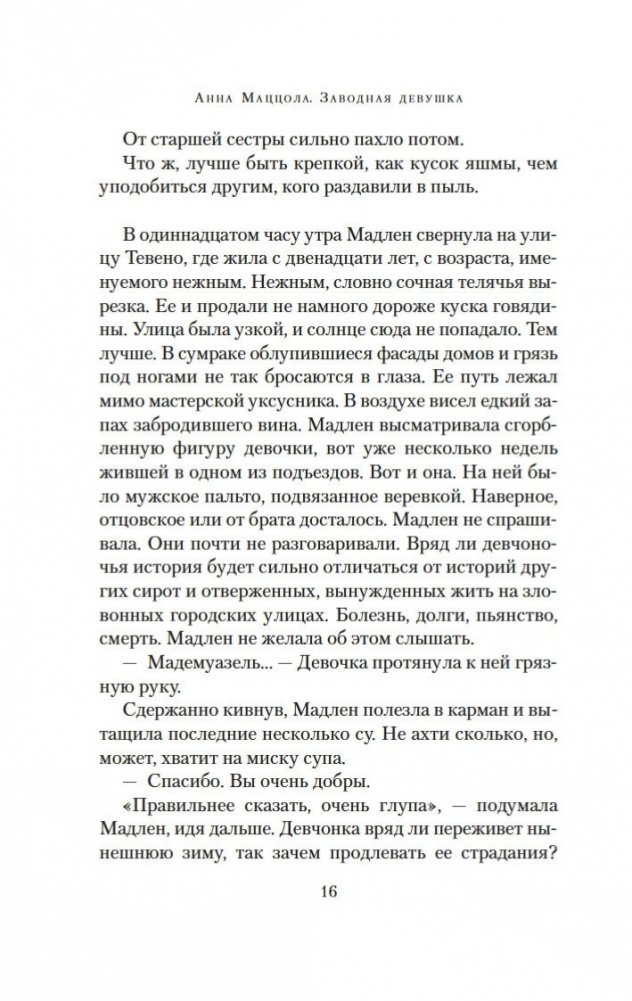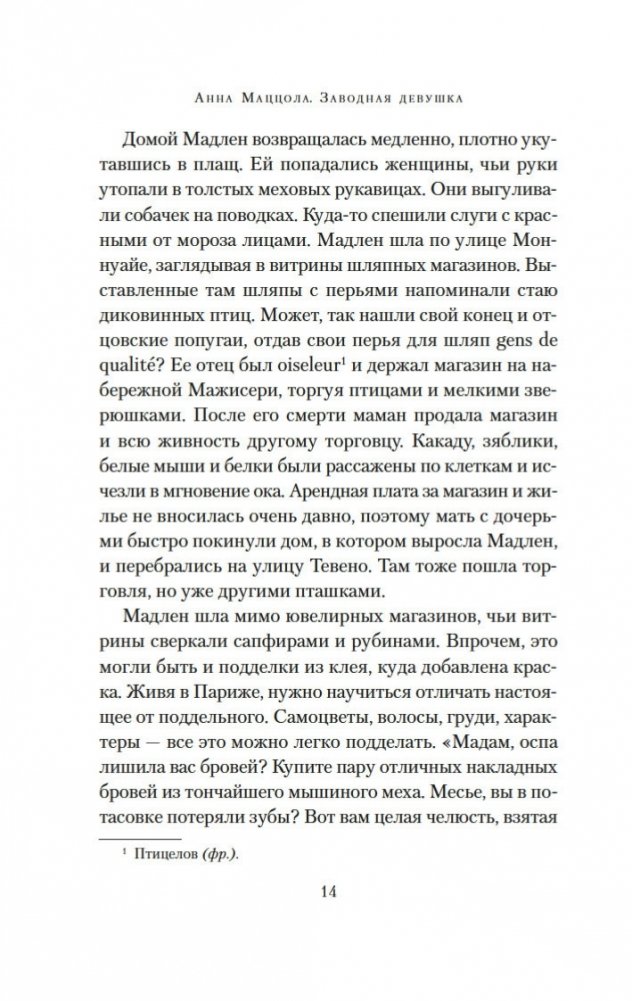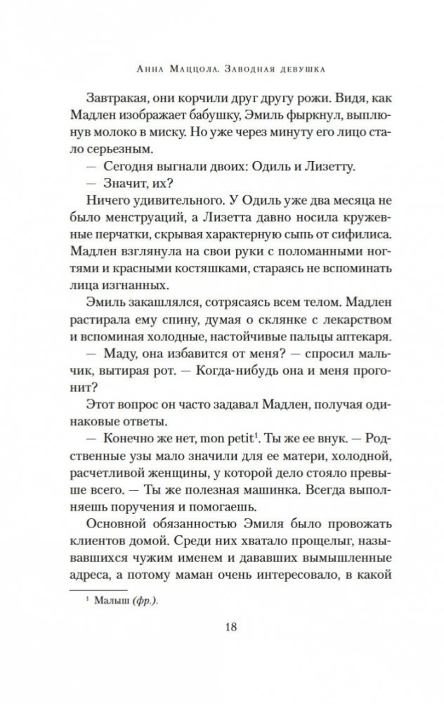 Париж. Зима 1750 года. В надежде на лучшую жизнь бывшая проститутка Мадлен устраивается горничной в дом знаменитого часовщика Рейнхарта. По заданию полиции девушка должна выяснить, чем в действительности занимается часовщик, ведь по городу ходят упорные слухи, будто Рейнхарт создает свои диковинные механизмы — украшенных драгоценностями птиц, серебряных пауков, кроликов, летучих мышей — с помощью магии, бросая вызов законам природы. Но в доме часовщика Мадлен чувствует себя крайне неуютно: ей кажется, будто она постоянно под прицелом чужих глаз. События принимают еще более зловещий оборот, когда с улиц начинают исчезать дети. Мадлен, исполненная решимости выяснить правду, с ужасом понимает, что, возможно, имеет дело с заговором, который ведет в самое сердце Версаля. Но что лежит в основе этого заговора? Кто такая заводная девушка? И что на самом деле ищет Мадлен? «Заводная девушка» — это потрясающая история об одержимости, иллюзиях и цене свободы.
