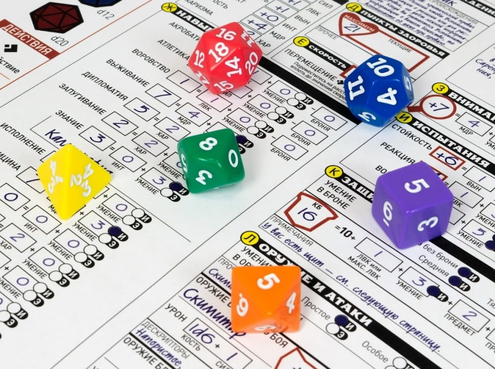 Основная механика игры – это проверки, основанные на бросках кубиков. Допустим, ваш герой хочет создать предмет или зелье – вы бросаете кубик и по результатам броска определяете, успешна ли его попытка. Необходимый результат зависит от сложности выполняемого действия, а профильные умения, связанные с этим действием, улучшают результат броска, прибавляя к нему дополнительные модификаторы. То есть, если ваш герой начинающий алхимик, у него больше шансов сварить зелье, чем у воина, который впервые видит алхимическое оборудование. Модификаторы могут как увеличивать результат броска, так и уменьшать – например, у воина с повреждённой рукой очевидно меньше шансов нанести сильный и точный удар по противнику. Если результат отличается от необходимого на 10 или более, то вас ожидает критический успех или провал. Например, вы маг и читаете сложное заклинание. Чтобы всё прошло успешно, вам нужно набрать 14 очков, но на кубике выпадает всего лишь 2. С учётом модификаторов, допустим, ваших умений, результат проверки увеличивается до 3, что на 11 меньше необходимого результата – в данной ситуации происходит критический провал и заклинание работает совсем не так, как вы ожидали, нанося большой урон вам и вашим союзникам. А если с учётом модификаторов результат броска будет 24 или больше, то заклинание напротив получится более чем успешным и сработает значительно лучше, чем ожидается. Одна из задач Ведущего – естественно описать результат этих бросков и вплести полученное в сюжет повествования.