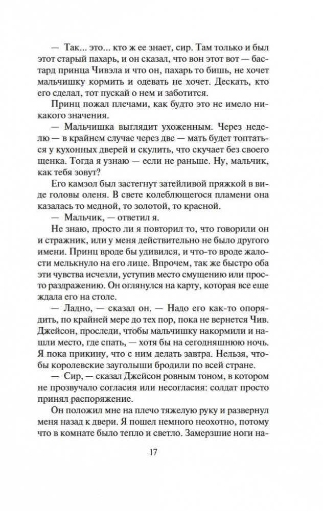 Фитц — незаконнорожденный сын наследного принца. Воспитанный слугами, он вырос в темных коридорах королевского замка, не зная ни почета, ни славы. Его ждала дорога убийцы, верно и преданно исполняющего приказы своего короля, а также участь человека, способного своими, может, не очень значительными поступками сдвигать мировые колеса и приводить в движение силы, недоступные пониманию простых людей... Но на то он и Фитц Чивэл Видящий!
