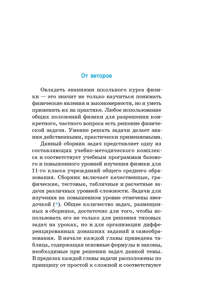 Сборник содержит задачи различных видов и уровней сложности, ответы и справочные материалы. Задания расположены в порядке возрастания сложности. Адресуется учащимся 11-го класса учреждений образования, реализующих образовательные программы общего среднего образования, изучающим физику на базовом и повышенном уровнях.