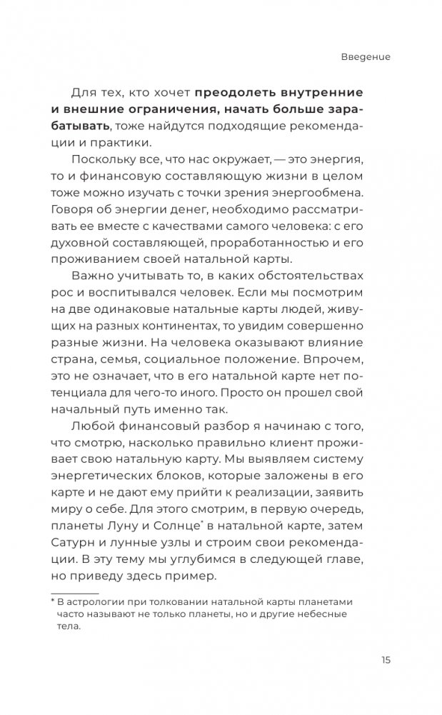 Прочитав эту книгу, вы узнаете, как с помощью астрологии выбрать направление, сферу или профессию, которые будут приносить стабильный и большой доход. Подберёте подходящую вам структуру и методы ведения бизнеса. Преодолеете внутренние и внешние ограничения, которые мешают вам выйти на новый финансовый уровень. А ещё — научитесь строить и читать натальную карту и использовать все её подсказки.