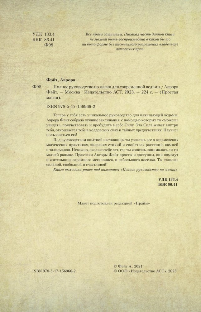 Перед тобой уникальное руководство для начинающих ведьм. Аврора Фэйт собрала заклинания, с помощью которых можно увидеть, почувствовать и пробудить в себе силу ведьмы. Эту силу ты встретишь повсюду, она живет внутри тебя. Ее пульс бьется в унисон с ритмом большого города, она открывается тебе в снах и тайных предчувствиях.