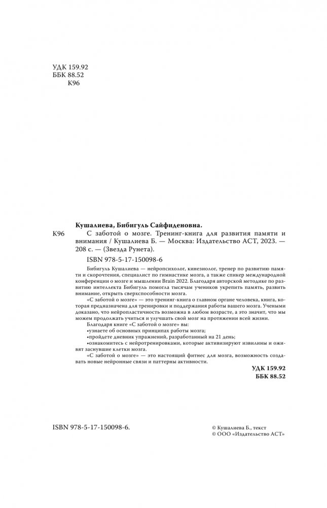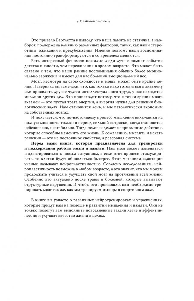 «С заботой о мозге» — это тренинг-книга о главном органе человека, книга, которая предназначена для тренировки и поддержания работы вашего мозга. Учеными доказано, что нейропластичность возможна в любом возрасте, а это значит, что мы можем продолжать учиться и улучшать свой мозг на протяжении всей жизни.