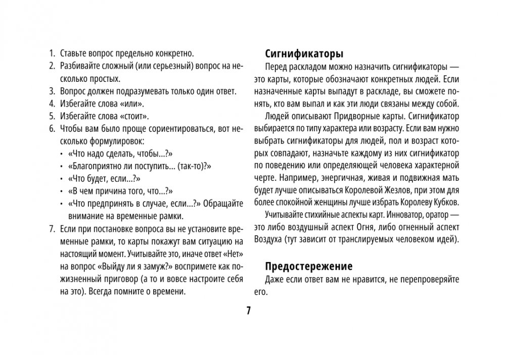 К колоде приложены 30 раскладов от самых простых (да/нет) до больших и сложных (расклад на год).