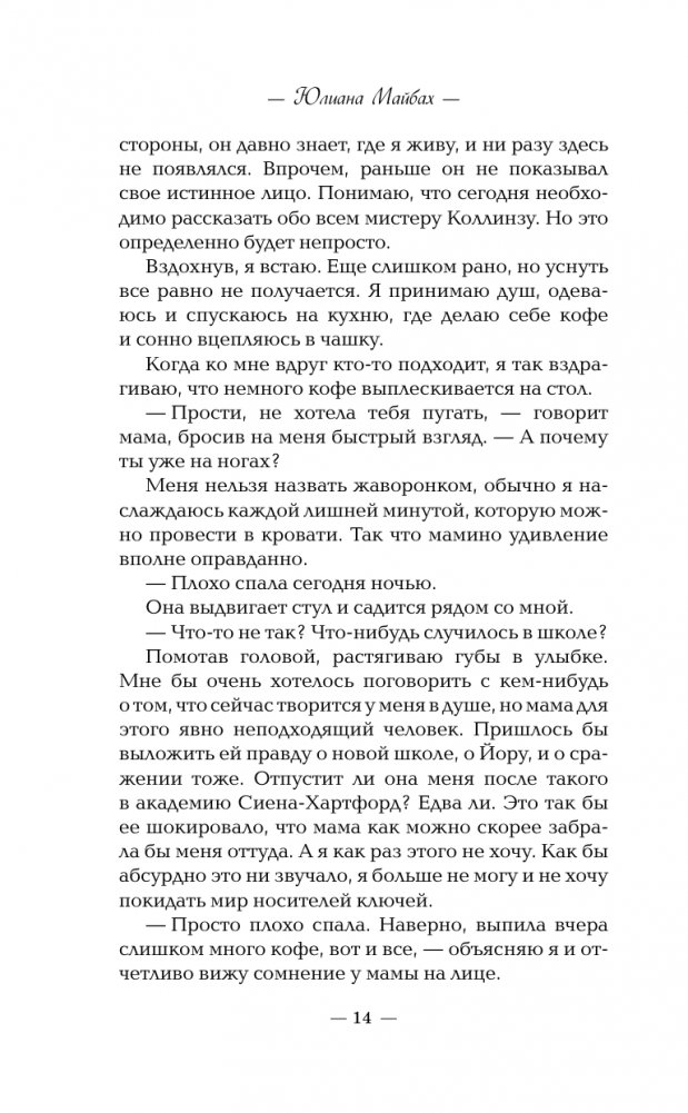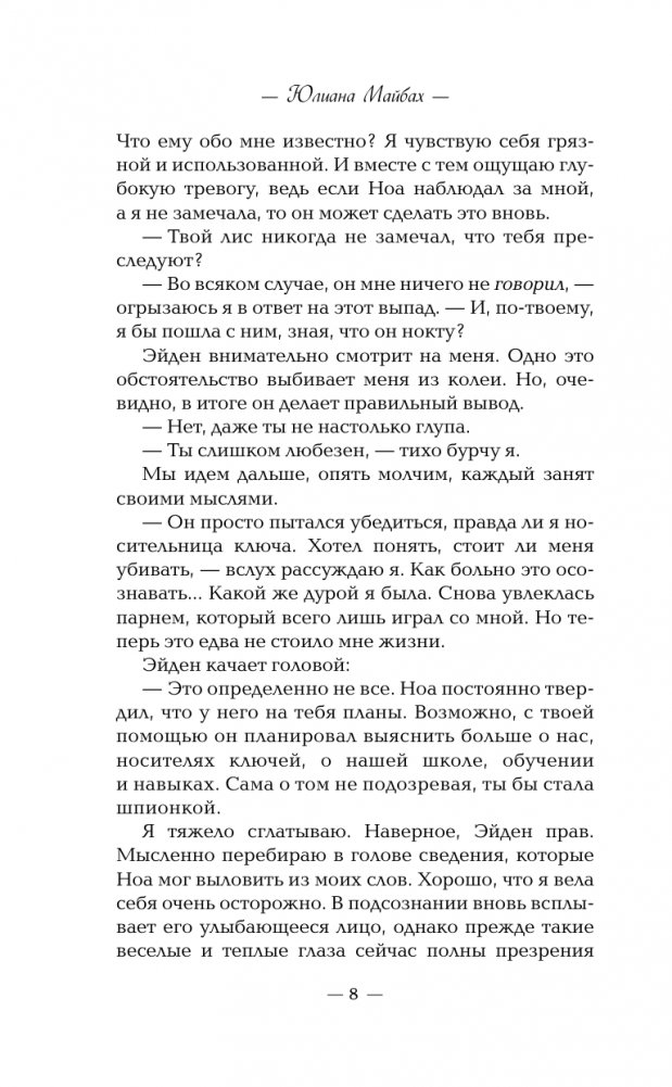 Тереза пытается освоиться в академии носителей ключей "Сиена Хартфорд". Это не так-то легко, ведь Эйден, сын директора, уверен: девушке не место в мире магии. И как будто этого мало, Ноа тоже не оставил ее в покое. Теперь Тереза знает его истинное лицо и хочет держаться от него подальше любой ценой. К сожалению, у парня совсем другие планы, и от него так просто не отделаться. Терезе предстоит выяснить, что стоит за враждой нокту и охотников, какие тайны скрывает академия и кто на самом деле управляет судьбами людей.