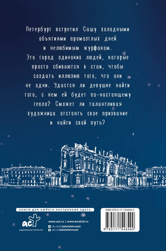 Петербург встретил Сашу холодными объятиями промозглых дней и нелюбимым журфаком. Это город одиноких людей, которые просто сбиваются в стаи, чтобы создать иллюзию того, что они не одни. Удастся ли девушке найти того, с кем ей будет по-настоящему тепло? Сможет ли талантливая художница отстоять свое призвание и найти свой путь?