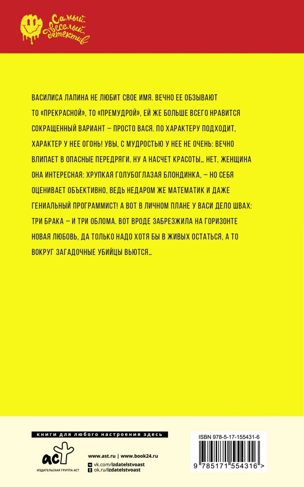 Василиса Лапина не любит свое имя. Вечно ее обзывают то "прекрасной", то "премудрой", ей же больше всего нравится сокращенный вариант – просто Вася. По характеру подходит, характер у нее огонь! Увы, с мудростью у нее не очень: вечно влипает в опасные передряги. Ну а насчет красоты… Нет, женщина она интересная: хрупкая голубоглазая блондинка, – но себя оценивает объективно, ведь недаром же математик и даже гениальный программист! А вот в личном плане у Васи дело швах: три брака – и три облома. Вот вроде забрезжила на горизонте новая любовь, да только надо хотя бы в живых остаться, а то вокруг загадочные убийцы вьются…