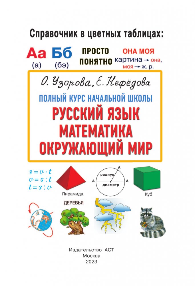 "Полный курс начальной школы. Русский язык, математика, окружающий мир" — это пособие для учащихся начальной школы, основанное на авторской методике известного педагога-практика О. В. Узоровой. В книге представлен курс занятий по основным предметам начальной школы: русскому языку, математике, окружающему миру. Все правила даны в пособии в виде цветных схем и таблиц. Учебный материал нагляден и прост для понимания, а цветовое оформление облегчает запоминание информации, делая процесс обучения эффективным. Занимаясь по книге, ученики освоят все трудные темы школьной программы и успешно подготовиться к проверочным работам.