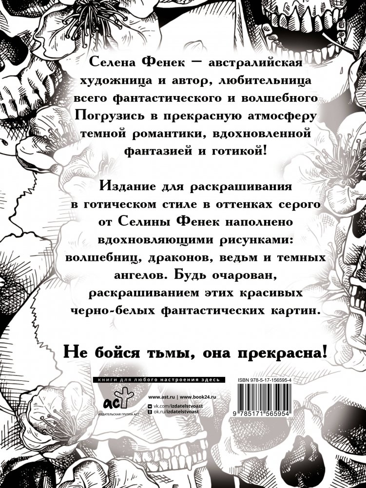 Погрузись в прекрасную атмосферу темной романтики, вдохновленной фантазией и готикой! Издание для раскрашивания в готическом стиле в оттенках серого от Селины Фенек наполнено вдохновляющими рисунками: волшебниц, драконов, ведьм и темных ангелов. Будь очарован, раскрашиванием этих красивых черно-белых фантастических картин.