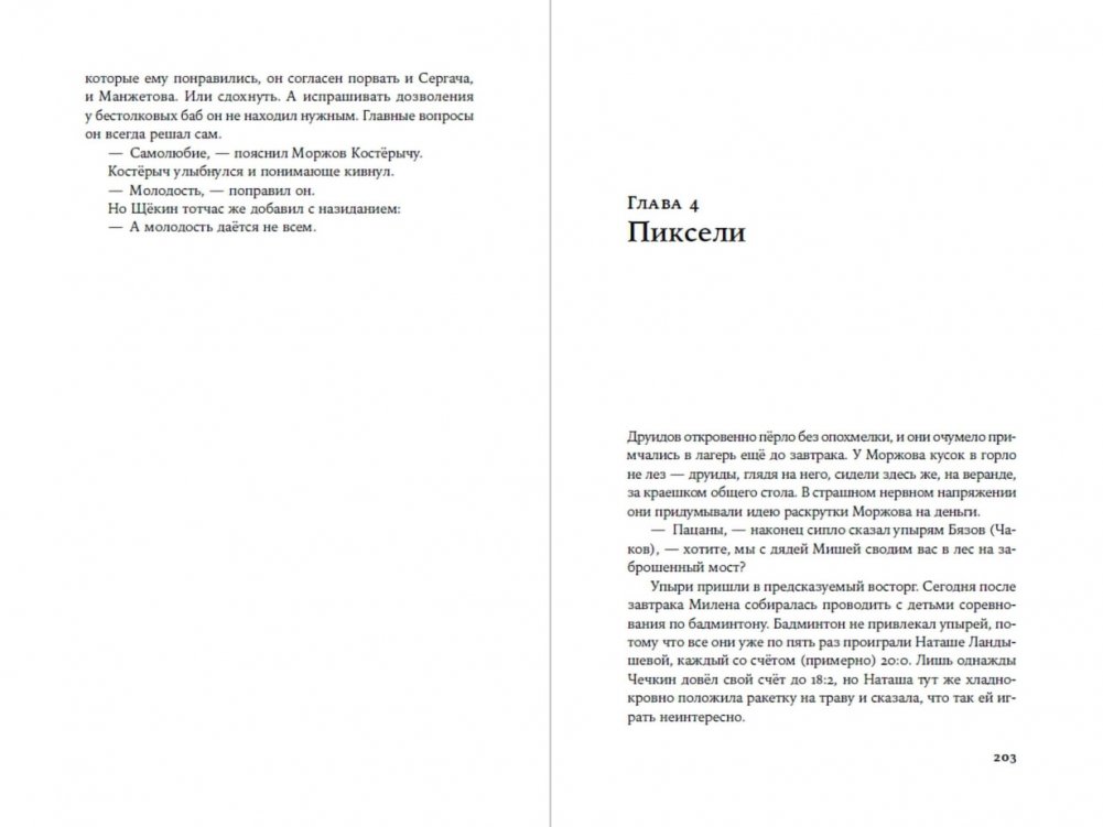 Главный герой, философ и бонвиван Борис Моржов, путешествует по прежним любовницам-училкам, как Чичиков по усадьбам помещиков, и «чичит» сертификаты — «мёртвые души» несуществующих обитателей лагеря. А ещё в романе есть проститутки, продажные менты, коррупционеры-чиновники, деревенские алкаши и много прочего пёстрого народа. Но весёлый роман формулирует очень серьёзный вопрос: что правильнее — быть успешным или быть подлинным?