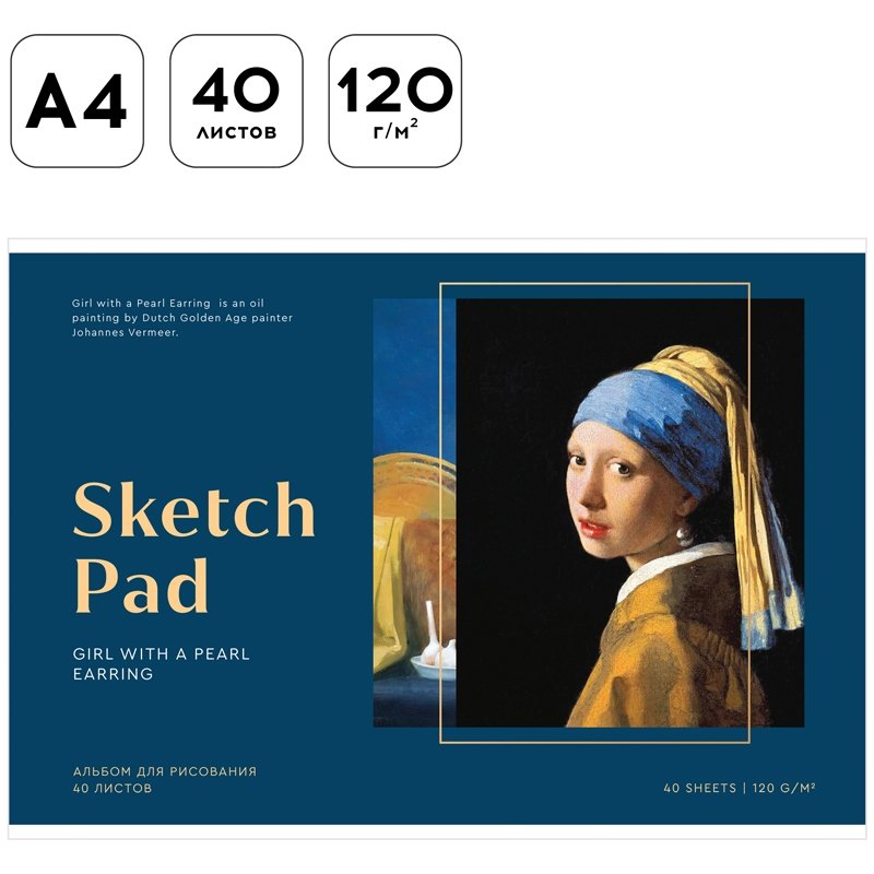 Альбом отлично подойдёт для рисования различными типами красок, фломастерами, цветными и чернографитными карандашами, гелевыми ручками. Дизайн обложки посвящен известной картине Яна Вермеера «Девушка с жемчужной серёжкой» и понравится ценителям искусства.