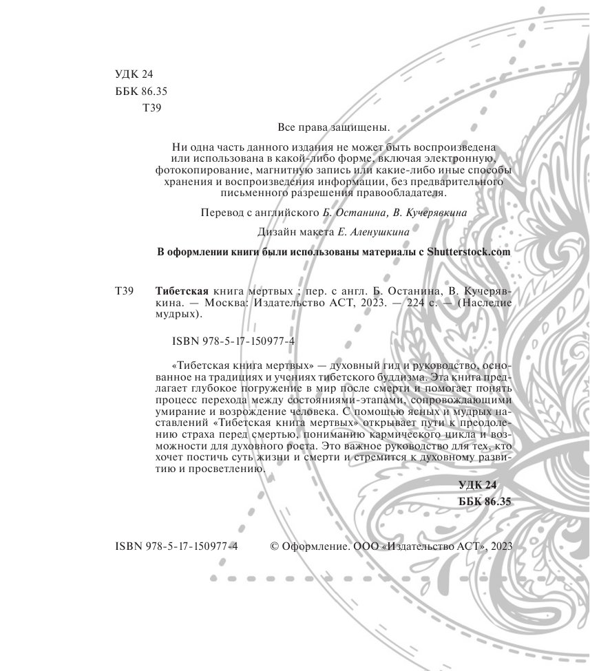 "Тибетская книга мертвых" — духовный гид и руководство, основанное на традициях и учениях тибетского буддизма. Эта книга предлагает глубокое погружение в мир после смерти и помогает понять процесс перехода между состояниями-этапами, сопровождающими умирание и возрождение человека. С помощью ясных и мудрых наставлений "Тибетская книга мертвых" открывает пути к преодолению страха перед смертью, пониманию кармического цикла и возможности для духовного роста. Это важное руководство для тех, кто хочет постичь суть жизни и смерти и стремится к духовному развитию и просветлению.