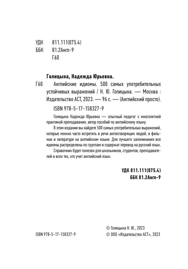 В этом издании вы найдете 500 самых употребительных выражений, которые можно часто встретить в речи англоговорящих людей, в фильмах и литературе на английском языке. Для лучшего запоминания все идиомы распределены по группам и содержат перевод на русский язык.