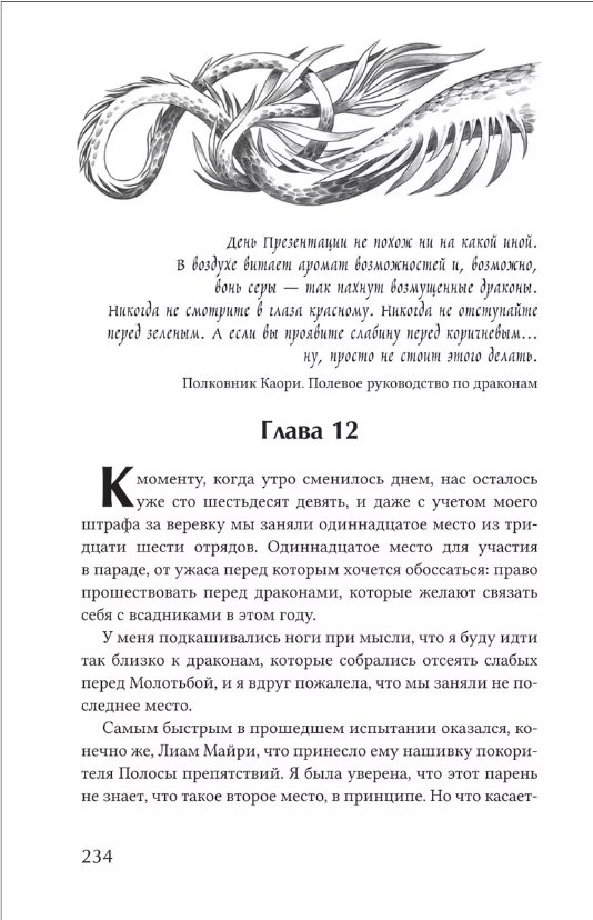 Двадцатилетняя Вайолет Сорренгейл готовилась стать писцом и спокойно жить среди книг и пыльных документов. Но ее мать – прославленный генерал, и она не потерпит слабости ни в каком виде. Поэтому Вайолет вынуждена присоединиться к сотням молодых людей, стремящихся стать элитой Наварры – всадниками на драконах.Однако из военной академии Басгиат есть только два выхода: окончить ее или умереть.Смерть ходит по пятам за каждым кадетом, потому что драконы не выбирают слабаков. Они их сжигают. Сами кадеты тоже будут убивать, чтобы повысить свои шансы на успех. Некоторые готовы прикончить Вайолет только за то, что она дочь своей матери. Например, Ксейден Риорсон — сильный и безжалостный командир крыла в квадранте всадников.Тем временем война, которую ведет Наварра, становится все более тяжелой, и совсем скоро Вайолет придется вступить в бой.