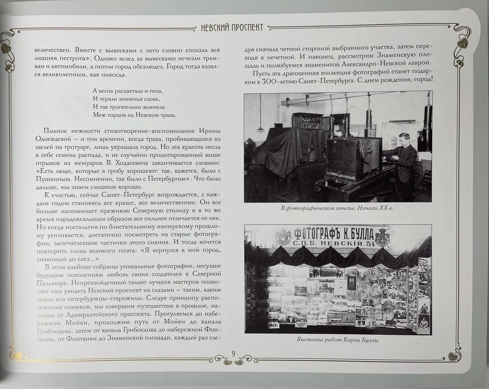 В альбоме собраны уникальные снимки первых профессионалов российской фотографии, и прежде всего признанного фотолетописца Петербурга Карла Буллы, которые поведали миру о великой судьбе Северной столицы, запечатлев на века кадры истории главной ее улицы — Невского проспекта.«Портреты» памятников скульптуры и архитектуры, зданий банков и торговых учреждений, доходных домов, различные виды городского транспорта, вывески, придающие неповторимый колорит облику городских улиц, а также официальная фотохроника и сценки бытового характера — словом, вся история этой удивительной улицы предстанет перед глазами читателей в фотокартинах ушедшей эпохи.