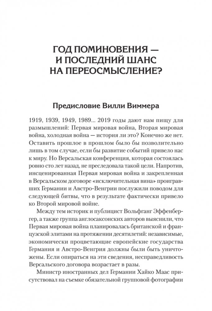 Многочисленные публикации и документы, которые стали доступны после открытия архивов в последние десять лет, проливают новый свет на скрытые и явные мотивы тех событий. Сегодня считается доказанным, что не только Германия, но и другие стороны конфликта были заинтересованы в большой войне. Однако никто не хочет признавать, что Версальский договор создал предпосылки для восхождения Гитлера к власти и развязывания Второй мировой войны. Говорить об этом необходимо, поскольку Версаль действует и сегодня, а подготовка к следующей большой войне идет полным ходом.