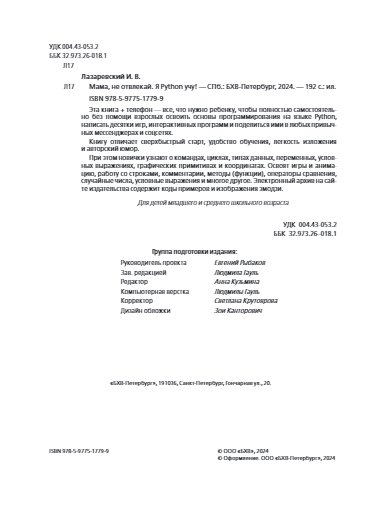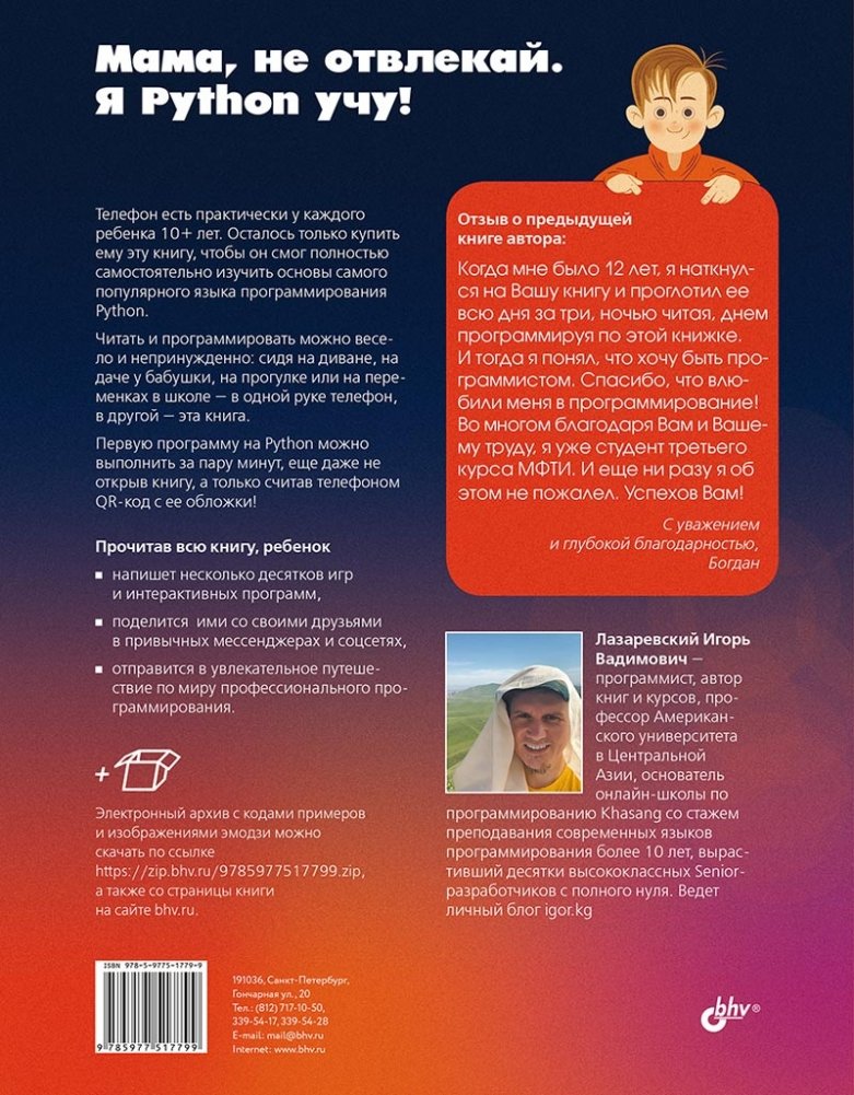 Эта книга + телефон – все, что нужно ребенку, чтобы полностью самостоятельно без помощи взрослых освоить основы программирования на языке Python, написать десятки игр, интерактивных программ и поделиться ими в любых привычных мессенджерах и соцсетях.