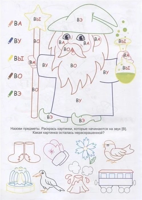 Ребенку предлагается произносить определенные слоги, одновременно раскрашивать детали рисунка, подбирать соответствующий цвет по образцу.