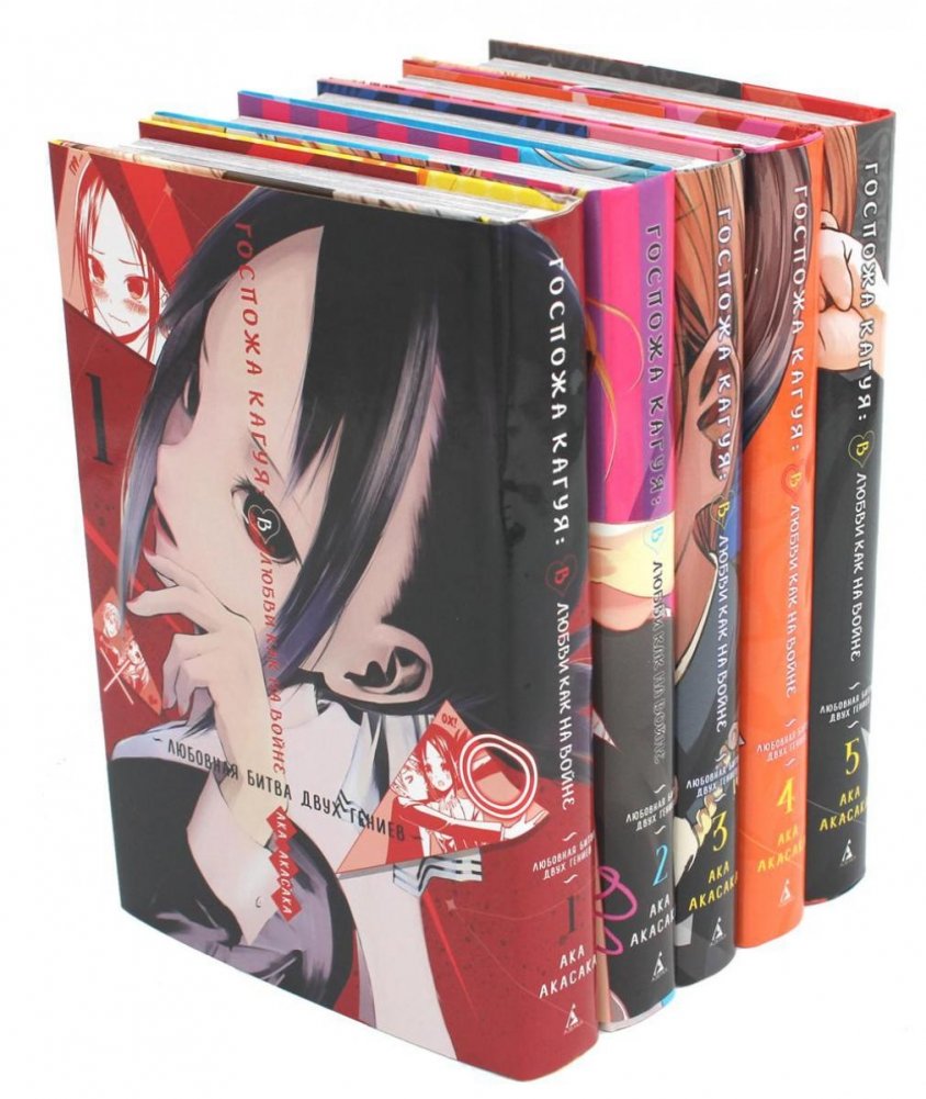 В комплект входят 5 томов популярной манги А. Акасака «Госпожа Кагуя: В любви как на войне: Любовная битва двух гениев».
