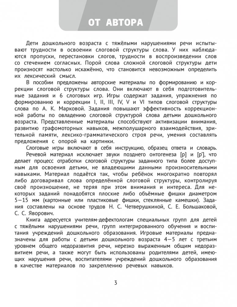 Пособие включает авторские материалы по формированию и коррекции слоговой структуры слова у детей 4—5 лет. Предложенные игры и задания способствуют активизации внимания, развитию графомоторных навыков и межполушарного взаимодействия, зрительной памяти.