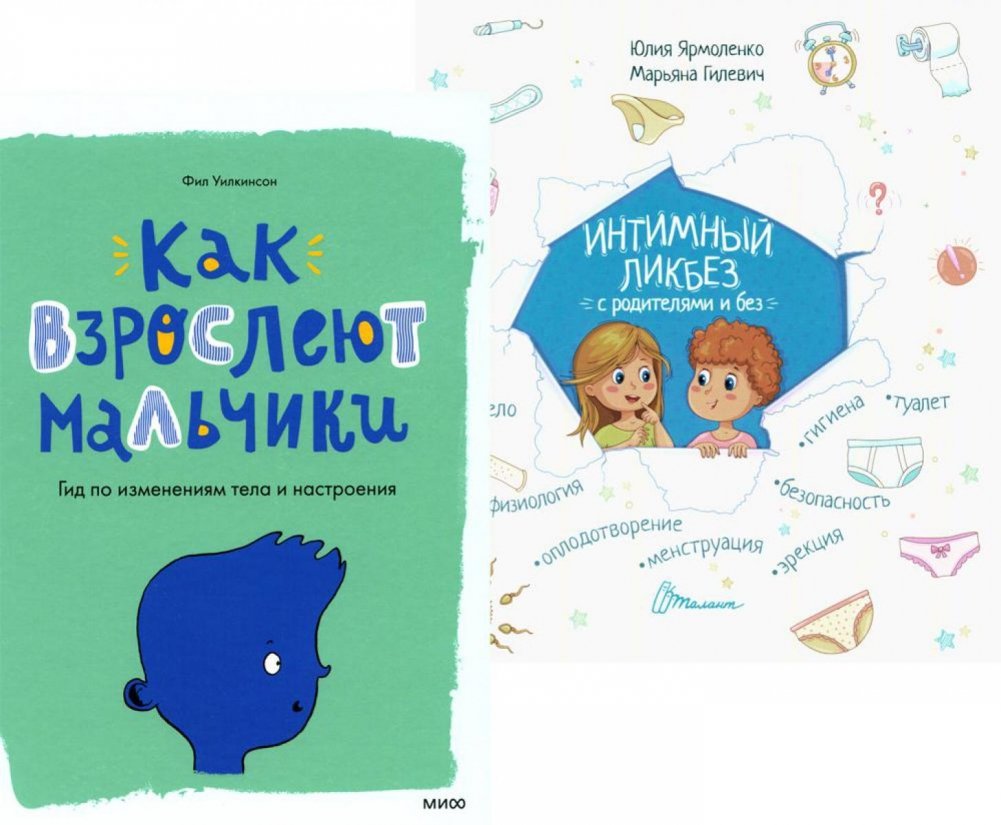 Комплект состоит из двух книг: «Как взрослеют мальчики. Гид по изменениям тела и настроения» и «Интимный ликбез с родителями и без».