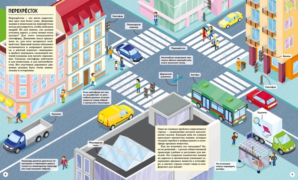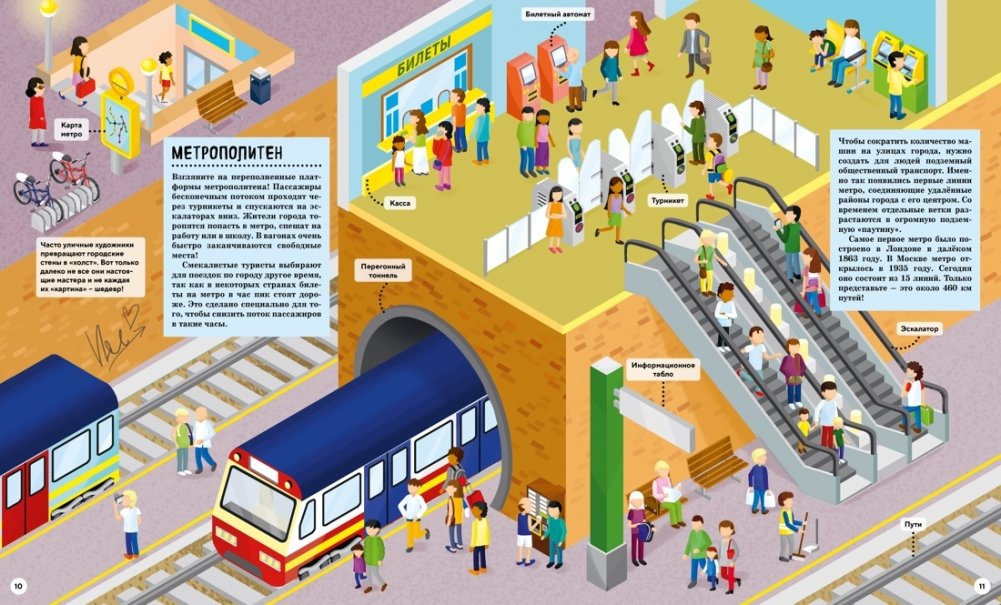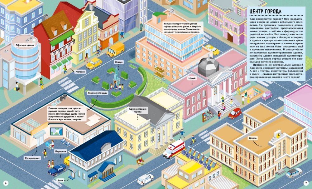 Чем заняться в парке или центре города? Какое оборудование используют для очистки сточных вод? Как проходит предполётный досмотр в аэропорту? Может ли стройка стать местом раскопок? Эта книга познакомит вашего ребёнка с городским пространством и расскажет о работе специальных служб: полиции, пожарных, скорой помощи. Детальные рисунки покажут устройство детского сада и университета, музея, банка и почты. Ваш ребёнок узнает всё о жизни в мегаполисе!