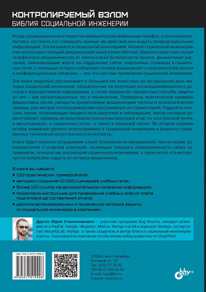 Книга рассматривает используемые современными киберпреступниками методы социальной инженерии и способы защиты от нее — как организационные, так и технические. Приведено 130 практических примеров атак, даны примеры фишинговых писем, раскрыты применяемые мошенниками психологические приемы и трюки, позволяющие вводить пользователей в заблуждение, подробно разобран используемый злоумышленниками программный инструментарий. Описаны различные векторы атак: по электронной почте,в мессенджерах, в социальных сетях и в реальной жизни. Предложена методика создания 10 000 сценариев учебных атак, а также дана пошаговая инструкция их проведения от этапа подготовки до составления отчета.