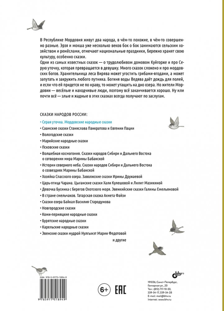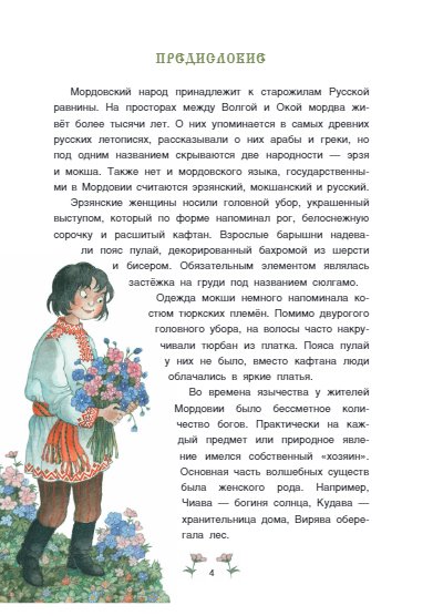 В Республике Мордовия живет два народа — эрзя и мокша. На первый взгляд они очень похожи, но различия все же есть: в языке, костюме, некоторых обрядах. А вот сказки у них одинаково веселые и с необыкновенными приключениями — «Серая уточка», «Куйгорож», «Как пчела в болоте увязла» и др. Часто героями сказок становятся боги лесов, воды и земли, которые до сих пор почитаются в Мордовии.