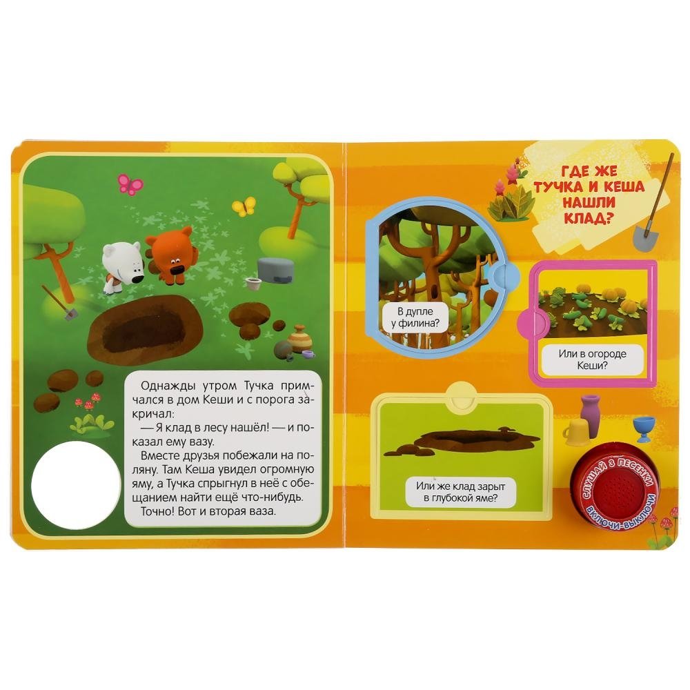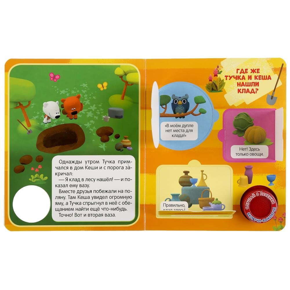Музыкальная книга с окошками «Ми-ми-мишки. Клад» ТМ «УМка» - отличный подарок для вашего малыша: - 1 звуковая кнопка - 3 песенки - интересный сюжет по мотивам мультсериала - подвижные элементы (секретные окошки) - красочные иллюстрации Ребёнок с удовольствием будет листать плотные страницы, рассматривать яркие картинки, открывать окошки и смотреть, кто там спрятался. Вместе с родителями он прочитает про приключения любимых персонажей, а также самостоятельно сможет понажимать на звуковую кнопку и послушать весёлые песенки. Малыш легко освоит включение звука: по нажатию на кнопку включится первая песенка, при втором нажатии выключится, в 3-ий раз - заиграет следующая песенка и т.д. Благодаря компактному формату книгу удобно взять с собой в дорогу. Музыкальная книга ТМ «УМка» развивает: - слуховое восприятие и музыкальный слух - навык чтения - фантазию - образное мышление - память Объём: 8 стр. Формат: 152 х 185 мм. Материал: пластмасса + картон. Работает от 3-х батареек типа LR1130 (в комплекте). Рекомендовано детям от 6 мес.