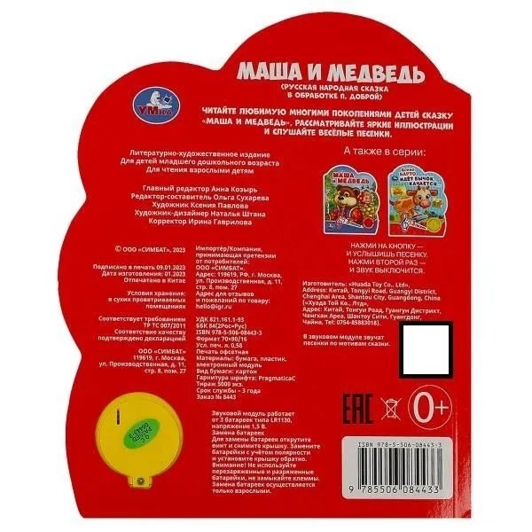 Музыкальная книга Маша и Медведь – это удивительная книжка игрушка, объединяющая в себе два захватывающих мира: чтение и игру на музыкальной игрушке. Уникальная книга с музыкальной кнопкой не только предоставляет ребенку возможность погрузиться в волшебный мир Маши и её друзей, но и позволяет легко исполнять простые и мелодичные песни из мультфильма.