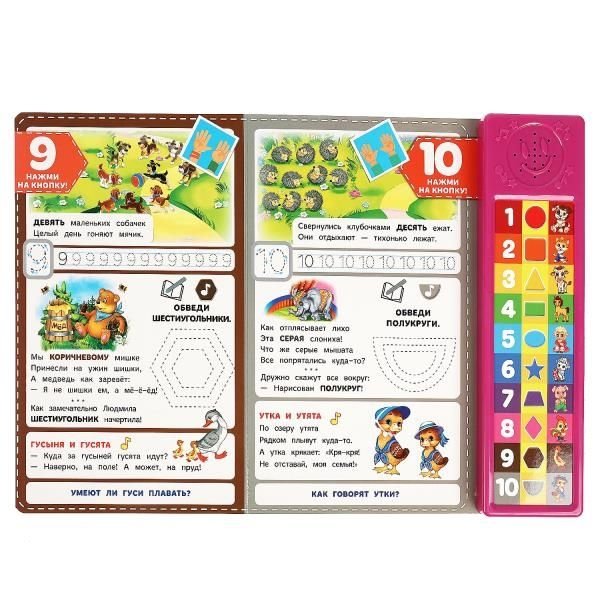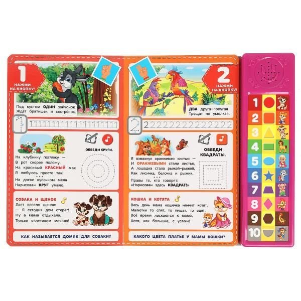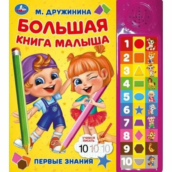 Озвученная книга «М. Дружинина. Большая книга малыша» ТМ «УМка» станет прекрасным обучающим подарком для маленького поклонника современных мультфильмов: 30 звуковых кнопок, прописи: можно использовать стираемый маркер, учимся писать, учим цифры, фигуры и животных, плотные красочные страницы, любимые персонажи. В игровой форме дети усваивают информацию в разы быстрее. Эта яркая книга поможет ребёнку не только познакомиться с цифрами, формами и животными, но и послушать добрые стихи Марины Дружининой, а также потренировать правописание в прописях. Книга сделана из плотного картона, поэтому родители могут не опасаться, что ребёнок порвёт странички. Объём: 10 стр. Формат: 213 х 235 мм. Материал: пластмасса + картон. Работает от 3-х батареек типа ААА (в комплекте). Рекомендовано детям старшего дошкольного возраста.