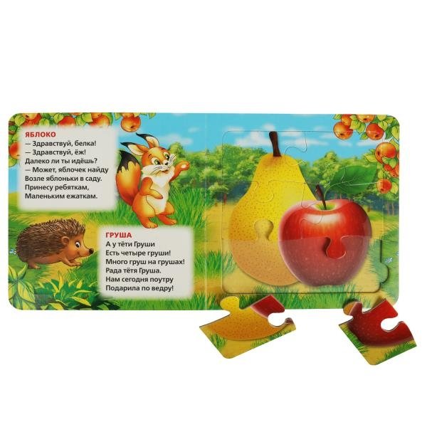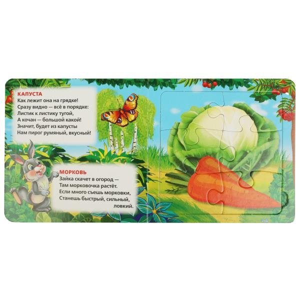 Данная книга выполняет сразу 2 функции: это и книга для чтения, и игра в пазлы. На каждом развороте малыша ждёт интересный стих Марины Дружининой, а также яркий пазл с изображением фруктов, ягод или овощей. Книжка изготовлена из плотного картона, поэтому мамы могут не опасаться, что ребёнок порвёт странички. Благодаря удобному формату книгу можно взять с собой в дорогу.