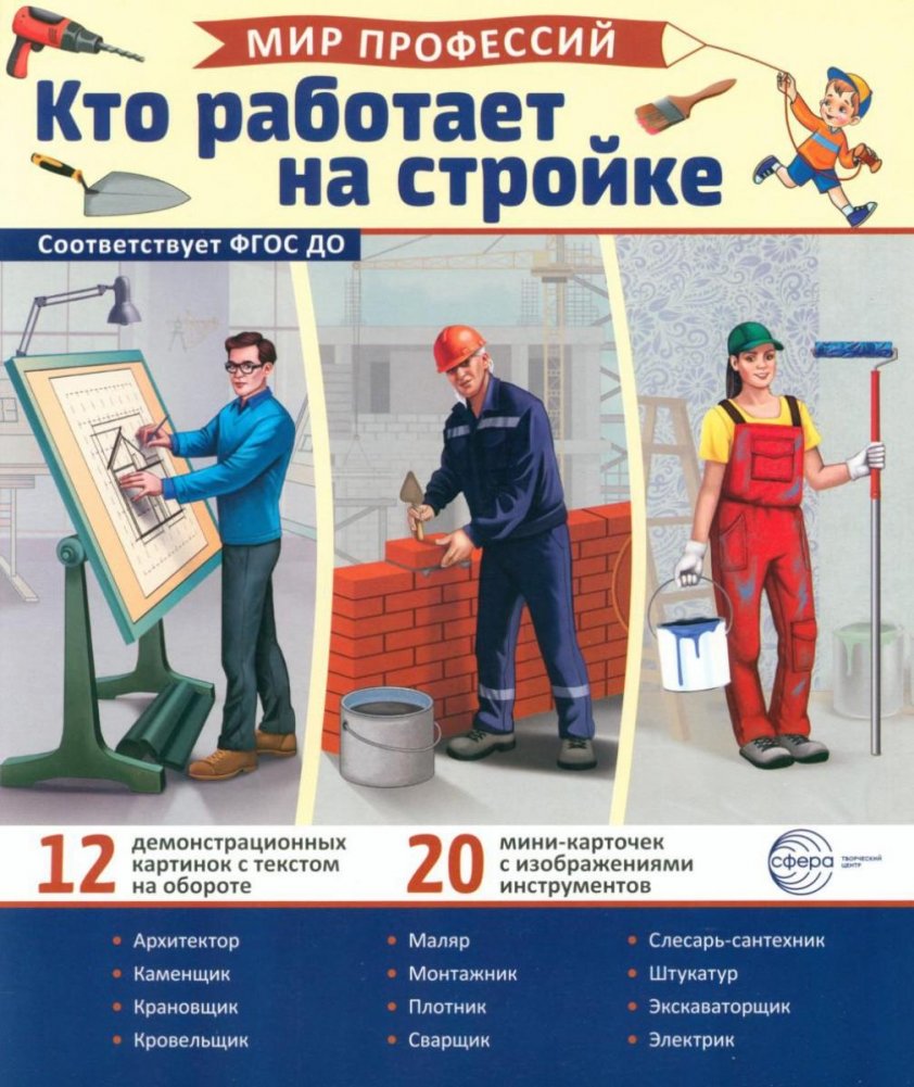 Комплект «Кто работает на стройке» серии «Мир профессий» содержит 12 демонстрационных картинок. На каждой из них изображён представитель той или иной строительной профессии. На обороте есть интересный и доступный рассказ, из которого дети узнают, чем занимается этот специалист, какие инструменты требуются ему для работы и почему эта профессия нужна и важна. В комплекте есть примеры игр и заданий, которые станут отличной тренировкой памяти и внимания, и вопросы на закрепление материала, а также карточки с изображениями строительных инструментов и заданиями на обороте. Комплект подходит как для индивидуальной, так и для групповой работы.