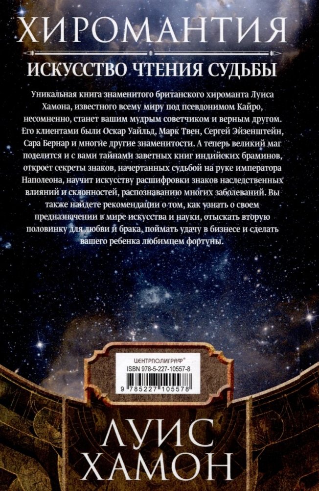Книга знаменитого британского хироманта Луиса Хамона, известного в европейских столицах под псевдонимом Кайро, содержит сведения о хиромантии, а также обширную базу любопытных фактов и жизненных историй людей, в разное время бывших клиентами маэстро. Значительная часть текста — практическое руководство со специальными методиками, которые позволят вам в короткое время овладеть искусством чтения знаков, начертанных судьбой на ваших ладонях.