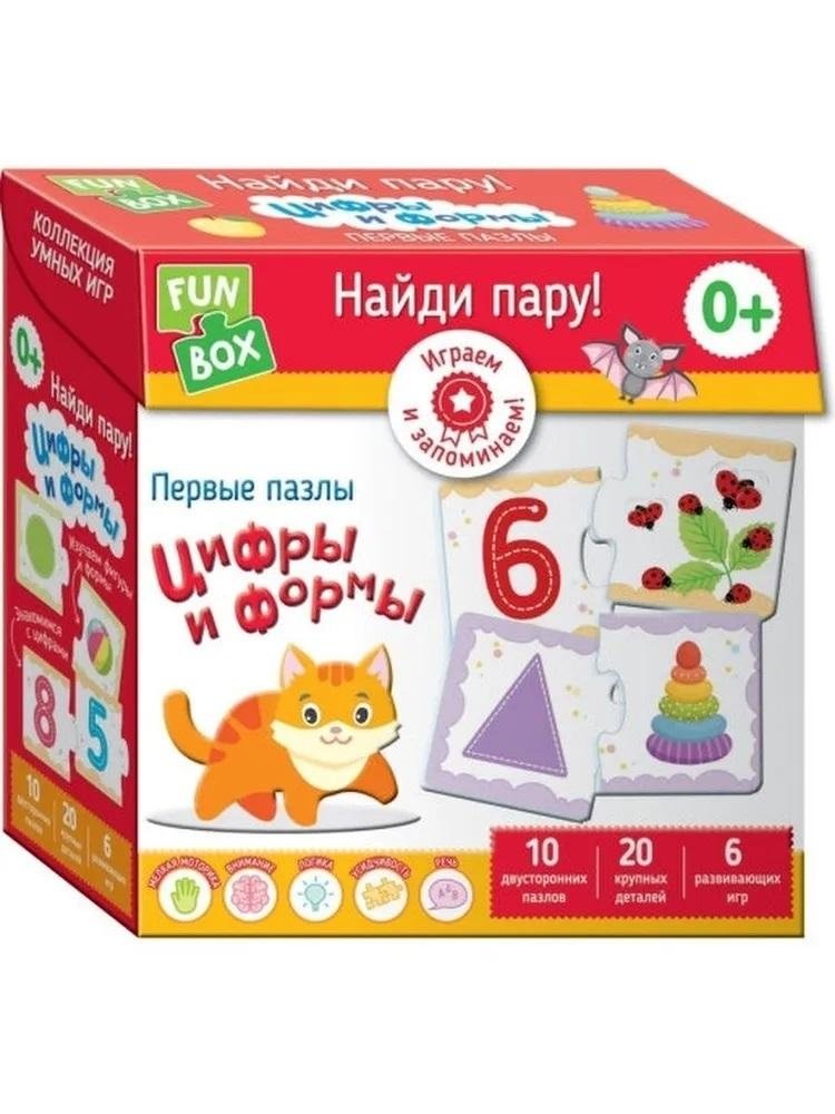 Уникальная коллекция развивающих игр "Fun Box", разработанная педагогами и психологами. Набор на возраст 0+ состоит из 20 крупных двусторонних карточек размером 11,9х12,9 см и инструкции. Пазлы состоят из двух деталей, и вместе составляют 10 целых картинок, последовательно собирая которые ребенок в игровой форме запоминает формы предметов, осваивает первые навыки счета и развивает логику, мелкую моторику, внимание. Скругленные углы и плотный картон делают пазлы абсолютно безопасными для малыша. В наборе 6 игр, подробно описанных в инструкции.