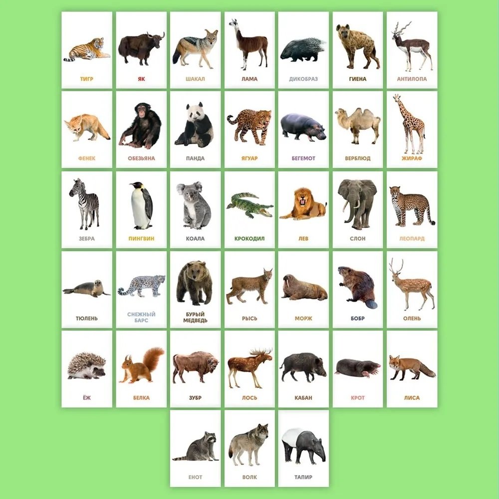 Обучающие карточки «Дикие животные» помогут расширить кругозора ребёнка, будут способствовать развитию речи и интеллекта малыша. Они познакомят ребят с дикими животными, помогут поскорее запомнить их внешний вид и особенности. Карточки яркие, красочные, рассматривать их очень интересно, а запоминать информацию, содержащуюся на них, очень полезно!
