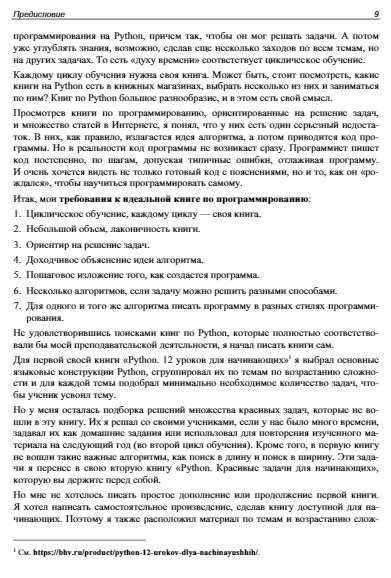 В книге приведены примеры решения различных практических задач на языке Python и предложено детальное пошаговое описание процесса написания программы для каждой из них. Подобраны задачи, которые имеют несколько вариантов решений и формируют алгоритмическое мышление. Показаны основы структурного, динамического, объектно-ориентированного, функционального программирования. Приведены способы работы с функциями, алгоритмы поиска в длину, в ширину, бэктрекинга, рекурсии. Материал расположен по возрастанию сложности, код программ снабжен комментариями, разъясняющими все языковые конструкции Python.